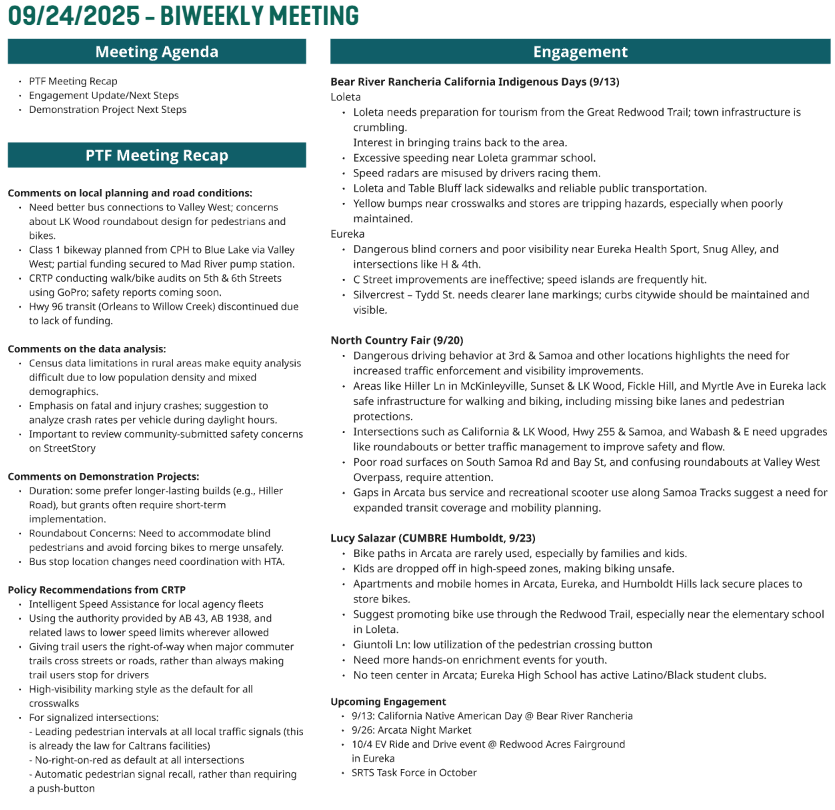 The project will fund several pop-up traffic safety demonstrations using temporary materials. City engineers, with input from the Project Task Force, are currently working to finalize project selection. Once the project list is finalized, HCAOG will obtain the required environmental clearance. Projects are expected to be installed in Spring 2026. Examples include mini-roundabouts, temporary speed humps, radar feedback, and other street calming measures. Once installed, monitoring and user feedback from the demonstrations will be used to inform the final recommendations of the Vision Zero Action Plan.