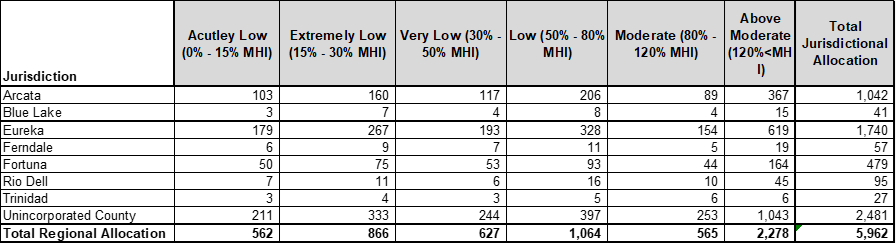 The table below is taken from the housing need determination letter for Humboldt County which was provided to HCAOG from HCD in July 2025. Staff members from HCD presented at the August 21, 2025 HCAOG Board meeting with detailed information about how the state arrived at these figures for our region. You can watch a recording of that presentation here.
